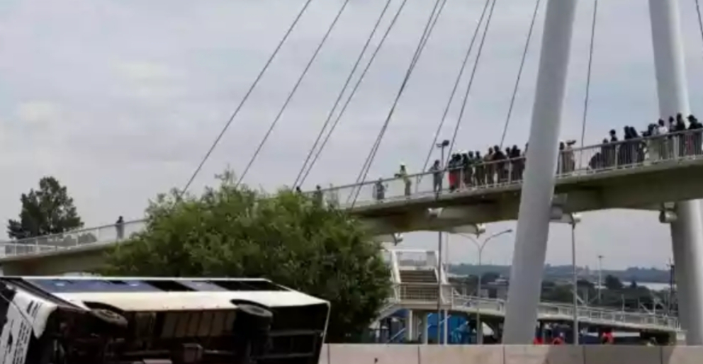 Pedestrians standing on a bridge look at a bus that overturned on a highway in Johannesburg, South Africa, on 11 March, 2025.