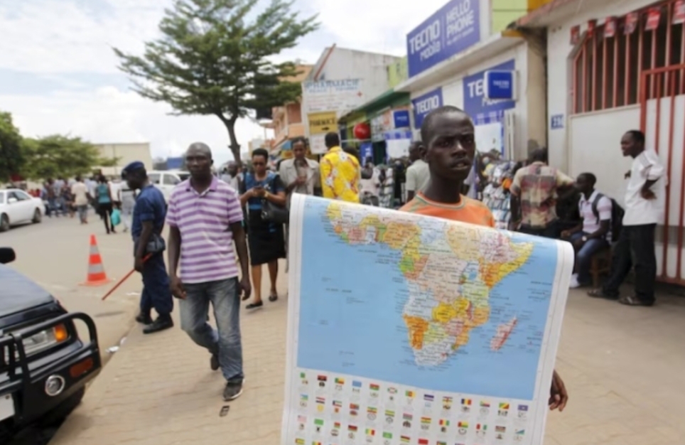 A vendor sells a map of Africa along the streets of Bujumbura, Burundi/April 24, 2015/REUTERS/Thomas Mukoya/File Photo via G