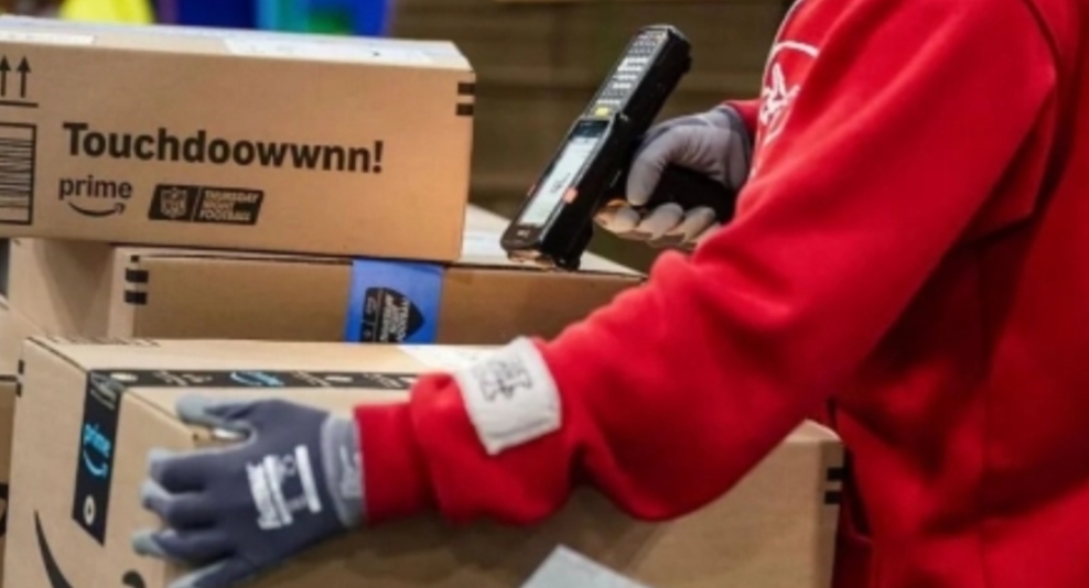 An Amazon fulfilment centre worker in a red pullover scans cardboard boxes of Amazon goods for delivery