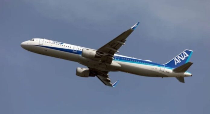 An All Nippon Airways (ANA) Airbus 321 taking off from Osaka, Japan on July 6, 2023
