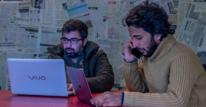 Fahad Shah, right, at his office in Srinagar, Indian controlled Kashmir on January 21, 2022