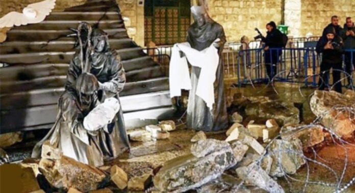 Bethlehem nativity scene depicted with rubble and razor wire.