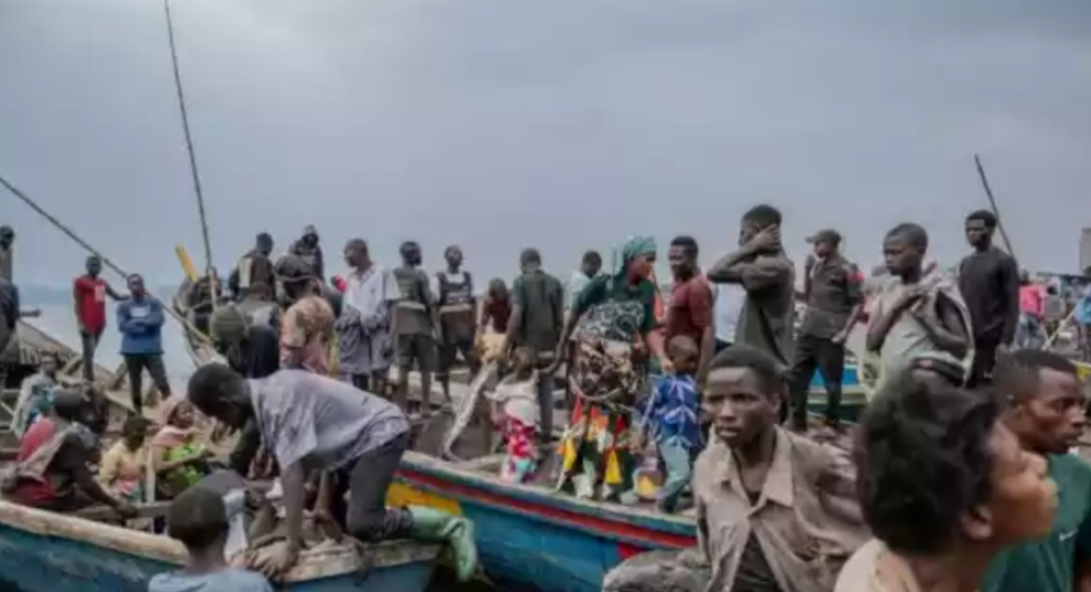 People fleeing M-23 rebel advances arrive by boat in Goma, 22 January, 2025