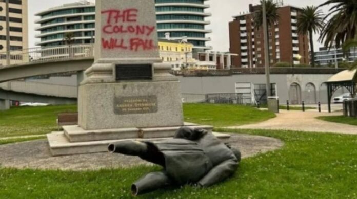 The vandals wrote “The colony will fall” on the Cook statue’s plinth.