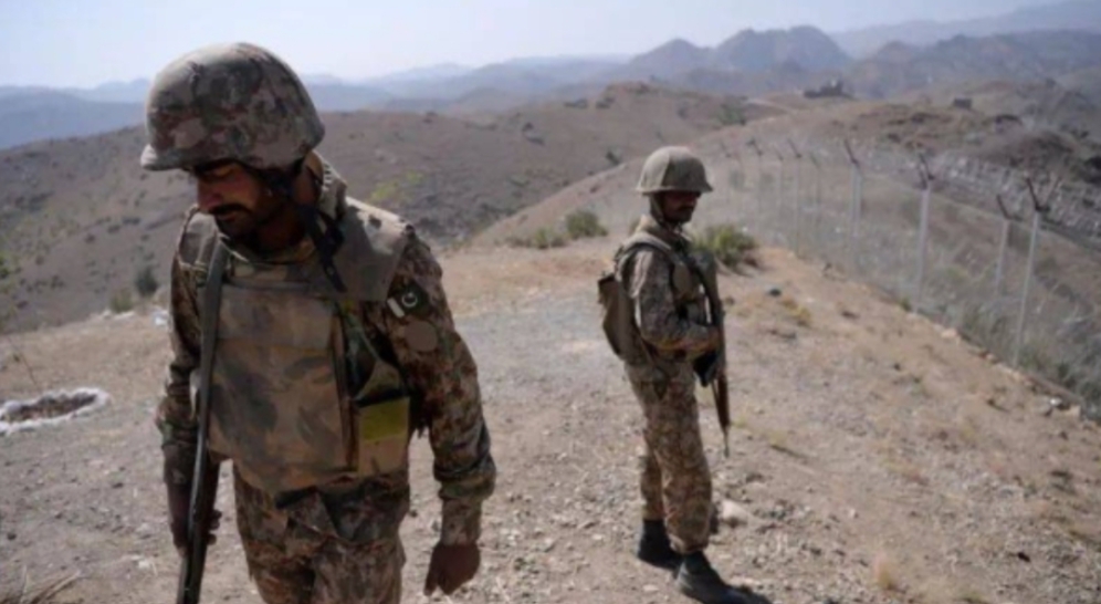 Pakistani soldiers patrol next to a newly fenced border fencing along Afghan border at Kitton Orchard Post in Pakistan’s North Waziristan in October 2017. (File photo) via SG.