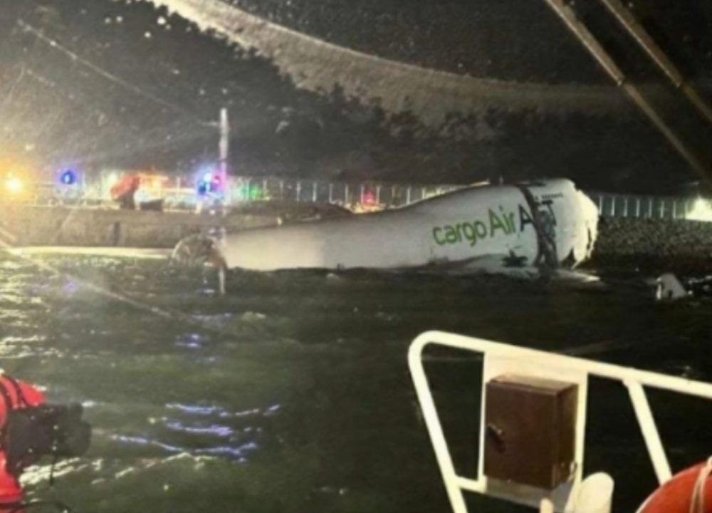 A cargo plane submerged in the sea after sliding off the runway upon landing at Hong Kong International Airport early Monday, October 20, 2025.