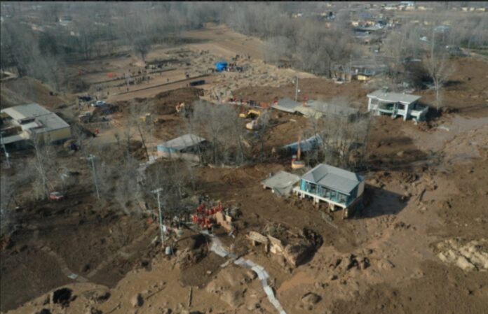 An aerial view shows buildings covered in silt amid rescue operations after the earthquake in Gansu’s Jishishan county triggered a mudslide in Jintian village, Qinghai province, China December 19, 2023. (credit: CNSPHOTO VIA REUTERS) via TJP