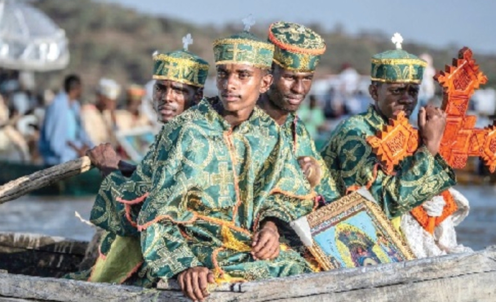 High priests riding in a boat as faithful celebrate Timket, the Ethiopian Epiphany, on lake Dembel, in Batu, Ethiopia.Â