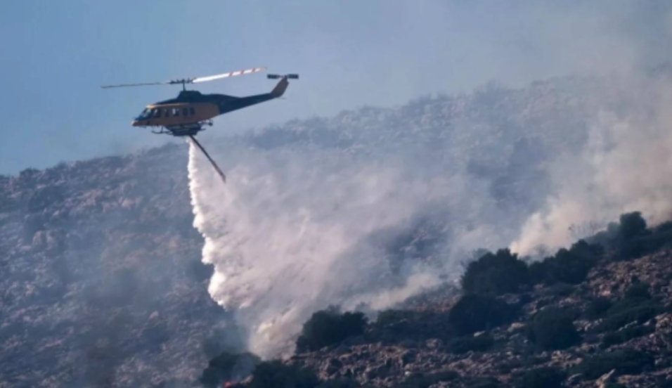 A firefighting helicopter drops water while battling a blaze in the seaside area of Charakas, 26 June, 2025
