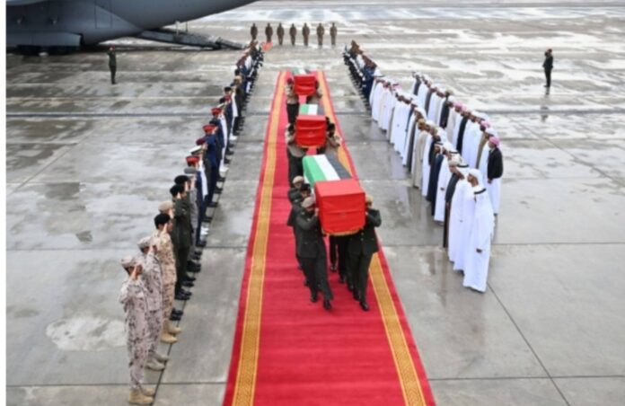 The remains of the martyred soldiers were repatriated to Abu Dhabi, arriving at Al Bateen Executive Airport aboard a military aircraft. (WAM) – courtesy SG