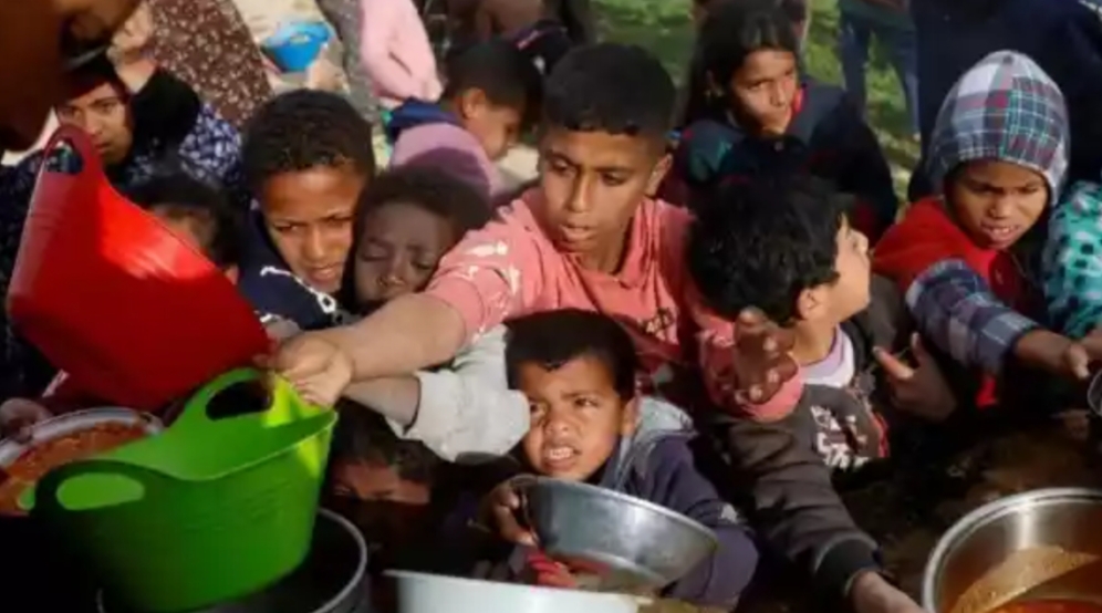 Palestinian children in Gaza gather to receive food cooked by a charity kitchen.