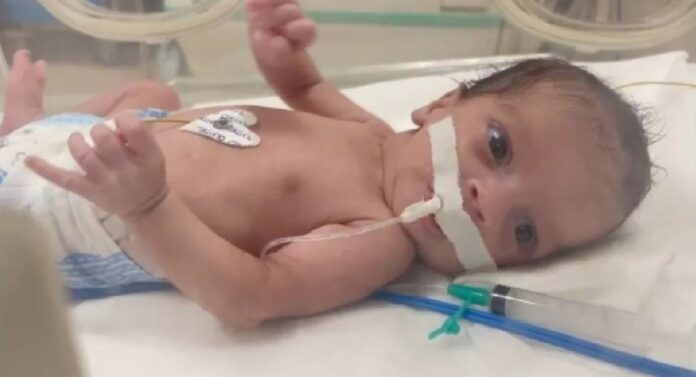 Born amid the horrors of the war in Gaza, this one month-old baby girl, lying in an incubator, has never known a parent’s embrace.