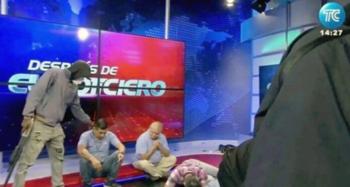 From Quito, the capital of Ecuador, comes a report that a group of armed men have broken into a live television studio in the city of Guayaquil and threatened staff, footage shows.