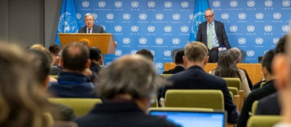 UN Secretary-General António Guterres (at podium) briefs reporters on recent developments in Israel and the Occupied Palestinian Territory. — courtesy UN Photo/Paulo Filgueiras