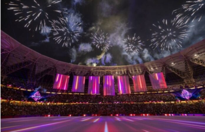 The opening ceremony, which featured laser and light shows along with seven banners announcing the participating teams, was signified by fireworks. The phrase “Welcome Champions” adorned the pitch.
