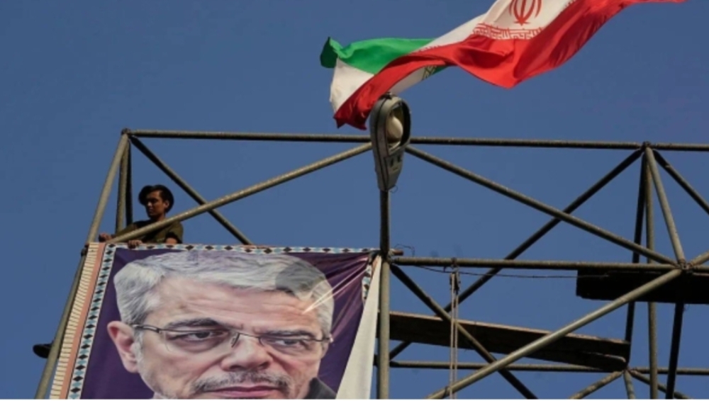 A worker posts a banner showing a portrait of Gen Mohammad Hossein Bagheri, who was killed in an Israeli strike in June, at Baharestan Square in Tehran, 22 September 2025
