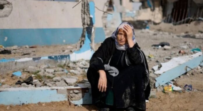 A woman sits next to a destroyed building in Rafah, southern Gaza.