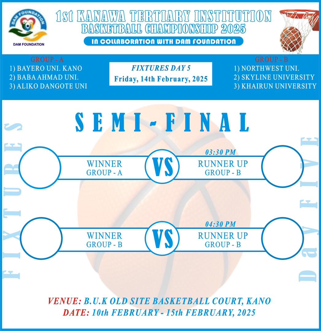 Khalifa Isyaku Rabiu university KHAIRUN basketball team will lock horns with Bayero university Kano BUK in the first semi final of the on-going 1st Kanawa Tertiary institution basketball championship today.
