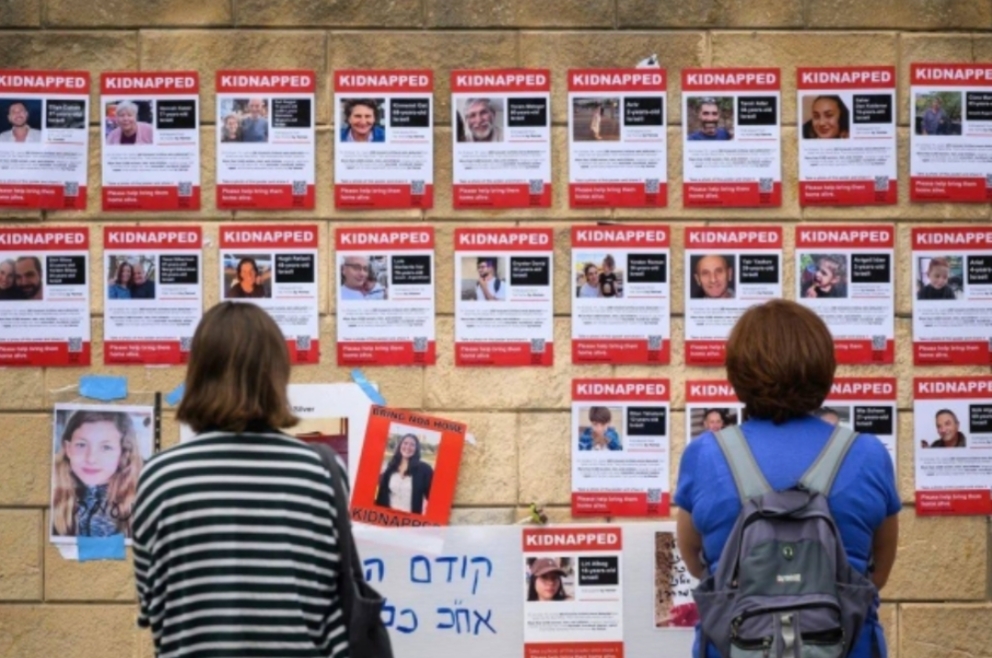 Photographs of some of those taken hostage by Hamas in Tel Aviv, Israel, on October 18, 2023