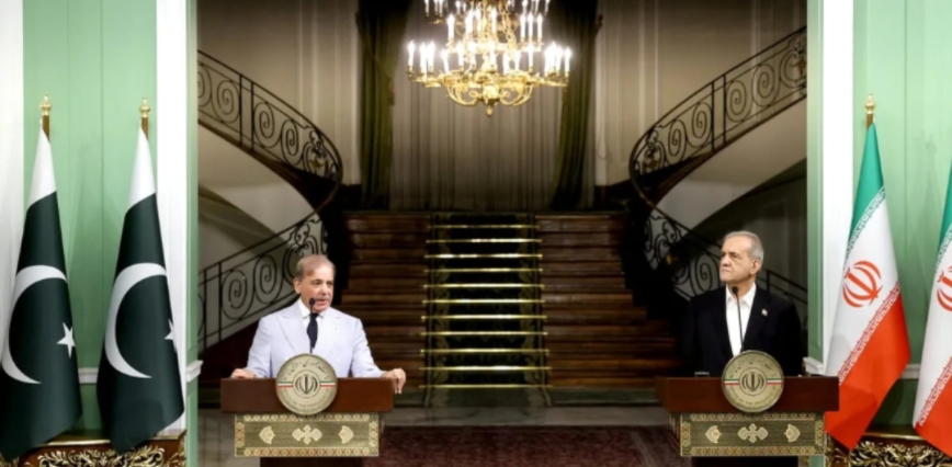 Iranian President Masoud Pezeshkian and Pakistan’s Prime Minister Shehbaz Sharif attend a joint press conference in Tehran, Iran, May 26, 2025. (photo credit: IRAN’S PRESIDENTIAL WEBSITE/WANA (WEST ASIA NEWS AGENCY)/HANDOUT VIA REUTERS) via TJP