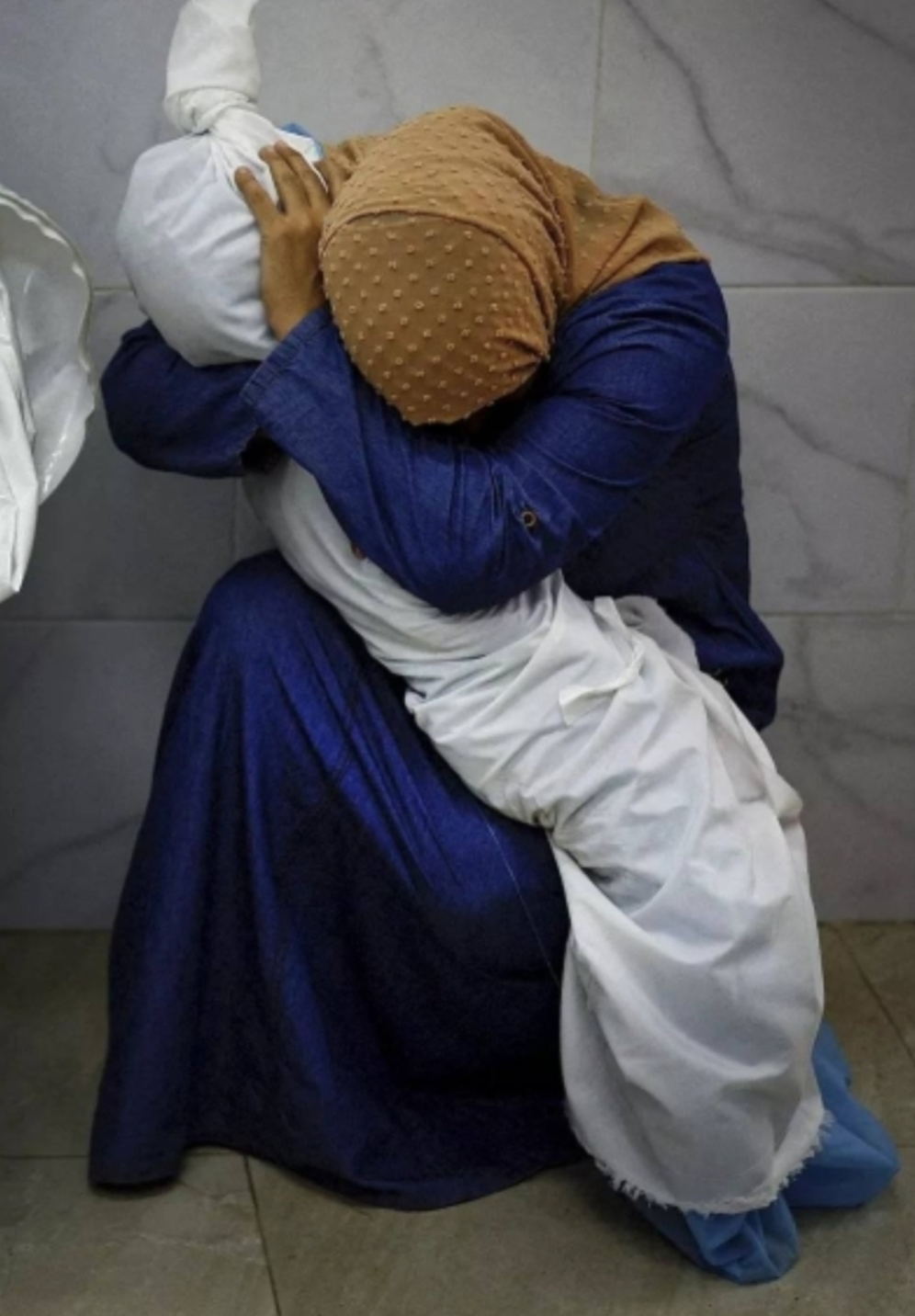 The photograph, taken on 17 October 2023 at Nasser hospital in Khan Younis in southern Gaza, shows 36-year-old Inas Abu Maamar holding five-year-old Saly, who was killed along with her mother and sister when an Israeli missile struck their home.