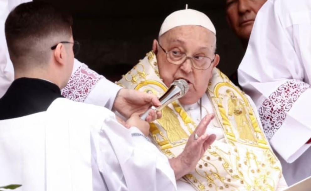 Pope Francis speaks from a balcony on the day of the “Urbi et Orbi” (to the city and to the world) message, at St. Peter’s Square, on Easter Sunday, in the Vatican, April 20, 2025. (photo credit: REUTERS/YARA NARDI) via TJP