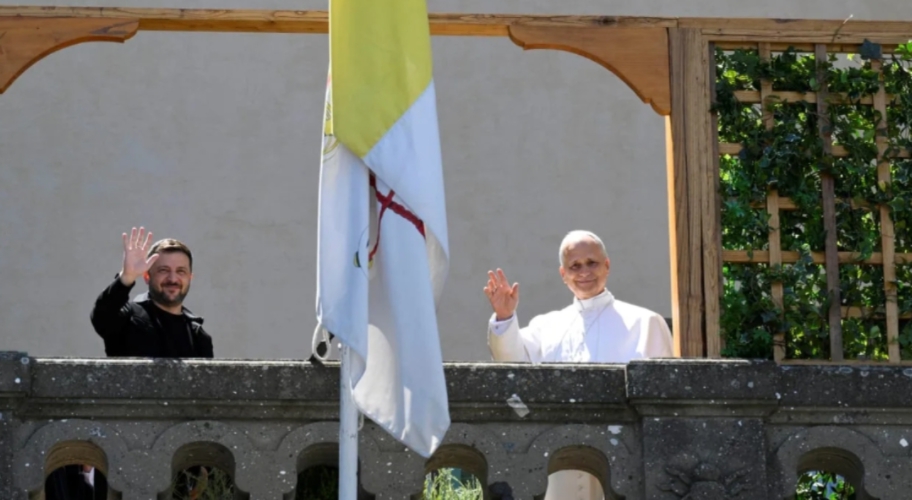 Pope Leo XIV and Ukrainian President Volodymyr Zelensky wave from a balcony during their meeting in Castel Gandolfo, Italy, July 9, 2025. (photo credit: VATICAN MEDIA/SI via TJP.