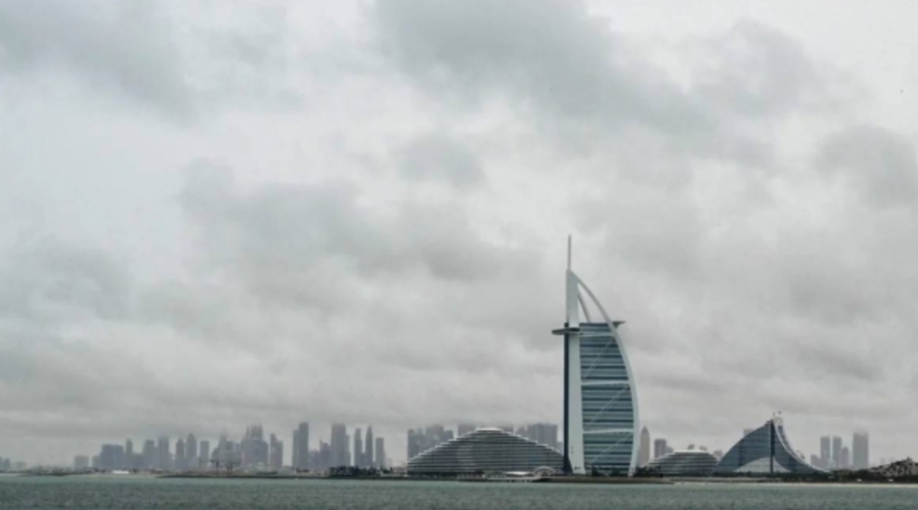 Thick clouds fill the sky above the Burj Al-Arab tower in Dubai on May 2, 2024, as heavy rains returned to the United Arab Emirates just two weeks after record downpours