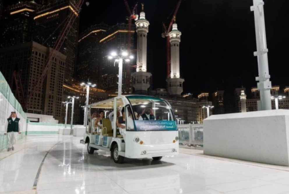 The smart golf cart service is made available on the roof of the Grand Mosque to serve the elderly and pilgrims with special needs.