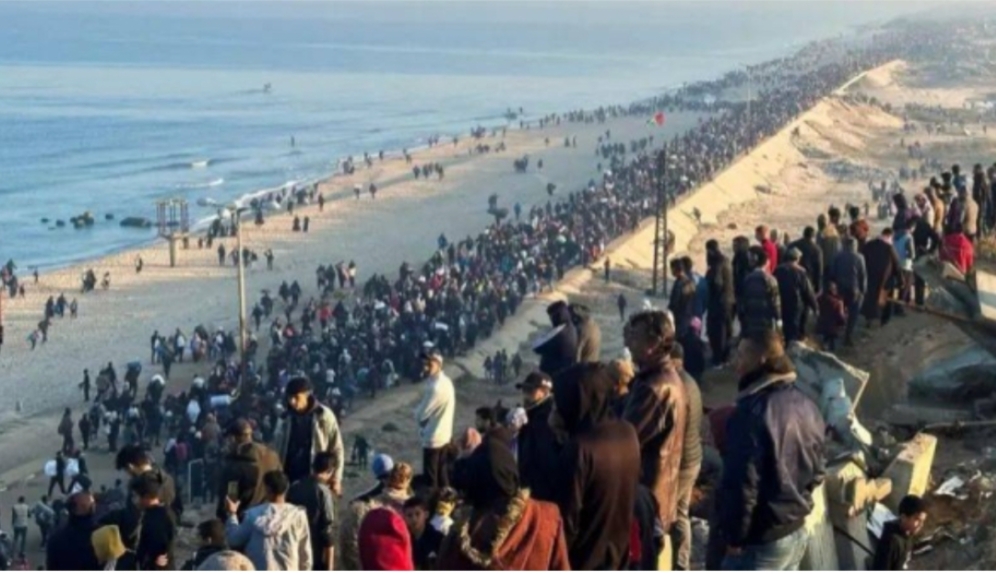 A long line of people are seen walking along the coast toward northern Gaza early Monday