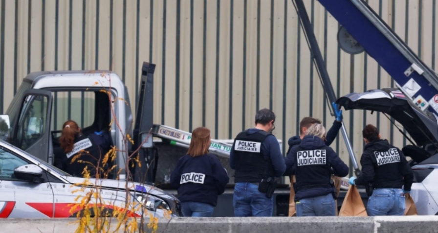 Police officers work near a crane believed to have been used in what the French Interior Ministry said was a robbery at the Louvre museum during which jewellery was stolen, in Paris, France, October 19, 2025 (photo credit: REUTERS/GONZALO FUENTES) via TJP