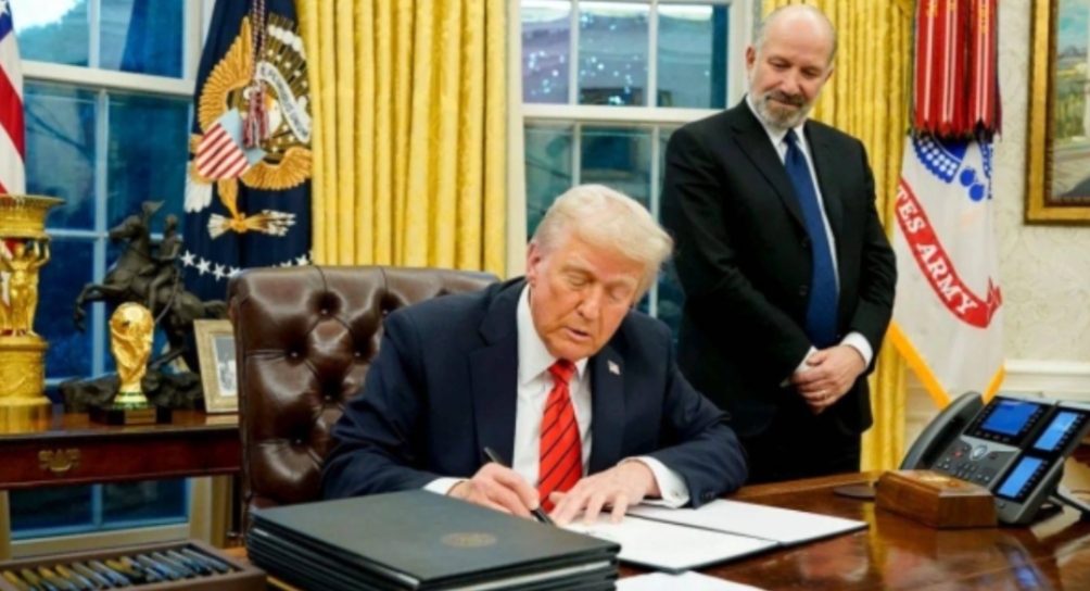 President Donald Trump signs executive actions in the Oval Office on Feb. 10, 2025