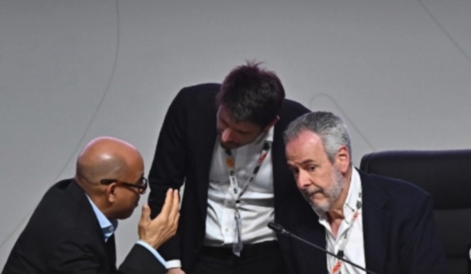 Brazil’s President Andre Correa do Lago listens to the executive secretary of the UN Framework Convention on Climate Change (UNFCCC) Simon Stiell (L) during the COP30 plenary session in Belem, Brazil, on 22 November 2025. — EPA via SG