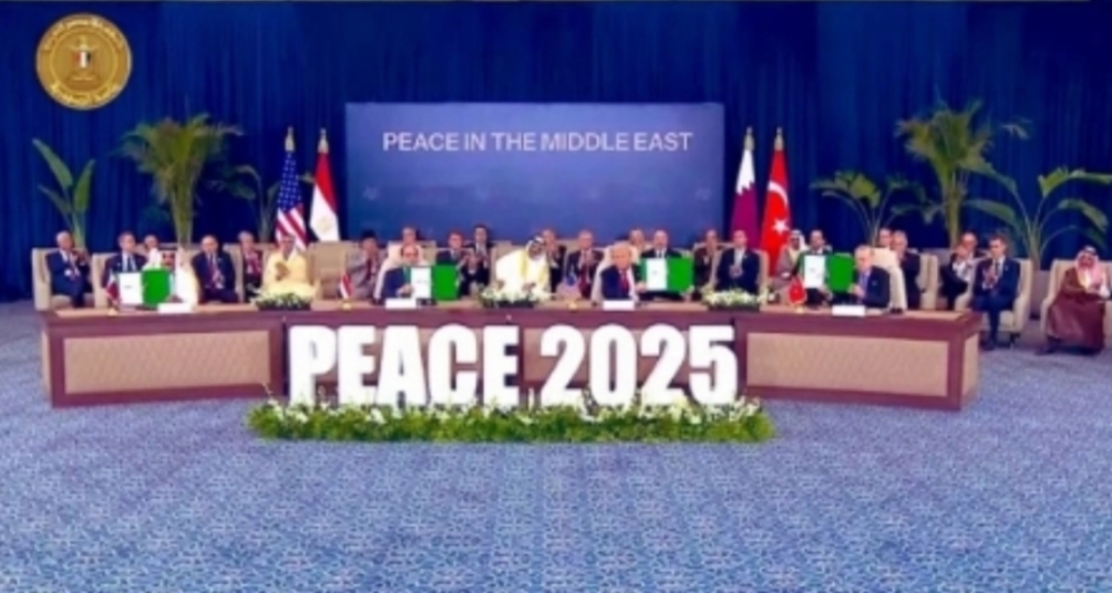 Trump, Egyptian President Abdel Fattah el-Sissi, Turkish President Recep Tayyip Erdoğan, and Qatari Emir Sheikh Tamim bin Hamad Al Thani signed the document on behalf of the participating nations, with world leaders seated behind them.