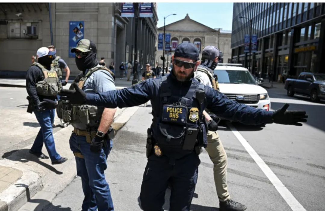 Law enforcement officers stand guard as protesters attempt to block US Immigration and Customs Enforcement personnel from leaving a court building in Chicago, Illinois on June 16, 2025 [Dylan Martinez/Reuters] via Al Jazeera.