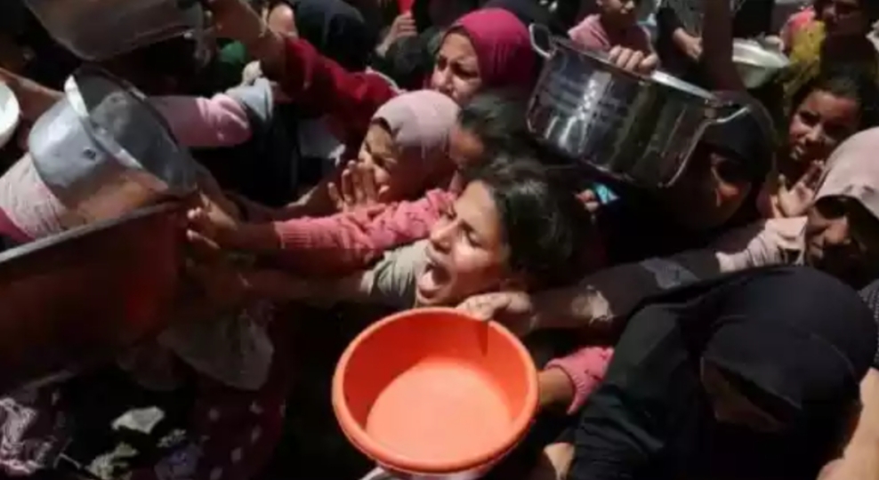 A large group of Palestinians wait to receive food cooked by a charity kitchen, in Jabalia, in the northern Gaza Strip. They are holding on pans and other receptacles and look distressed.