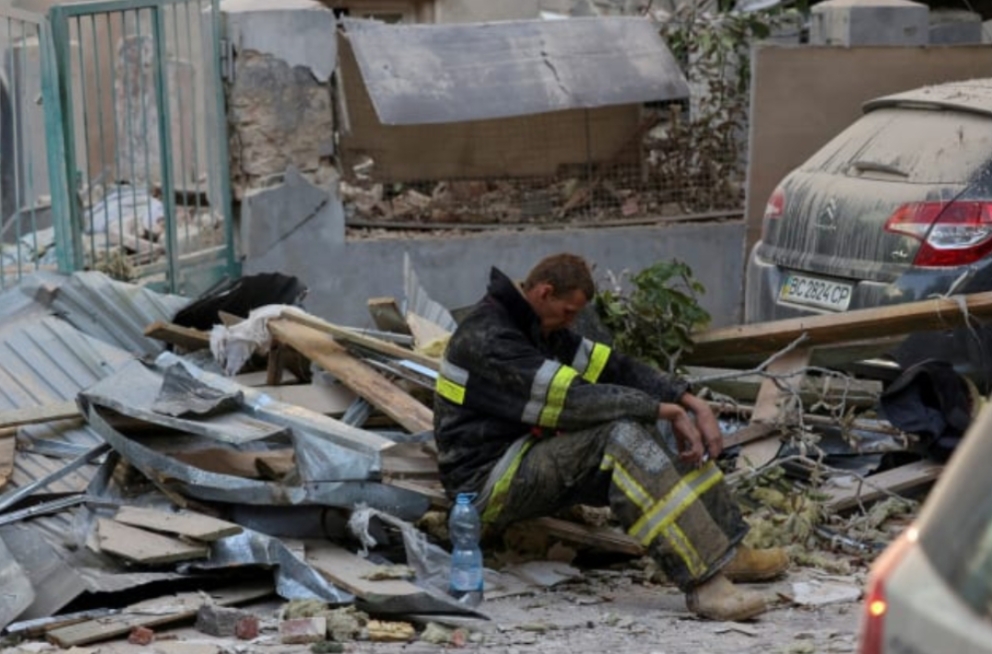 A rescuer rests at the site of a Russian drone and missile strike on residential buildings, amid Russia’s attack on Ukraine, in Lviv, Ukraine September 4, 2024. (photo credit: REUTERS/ROMAN BALUK) via TJP